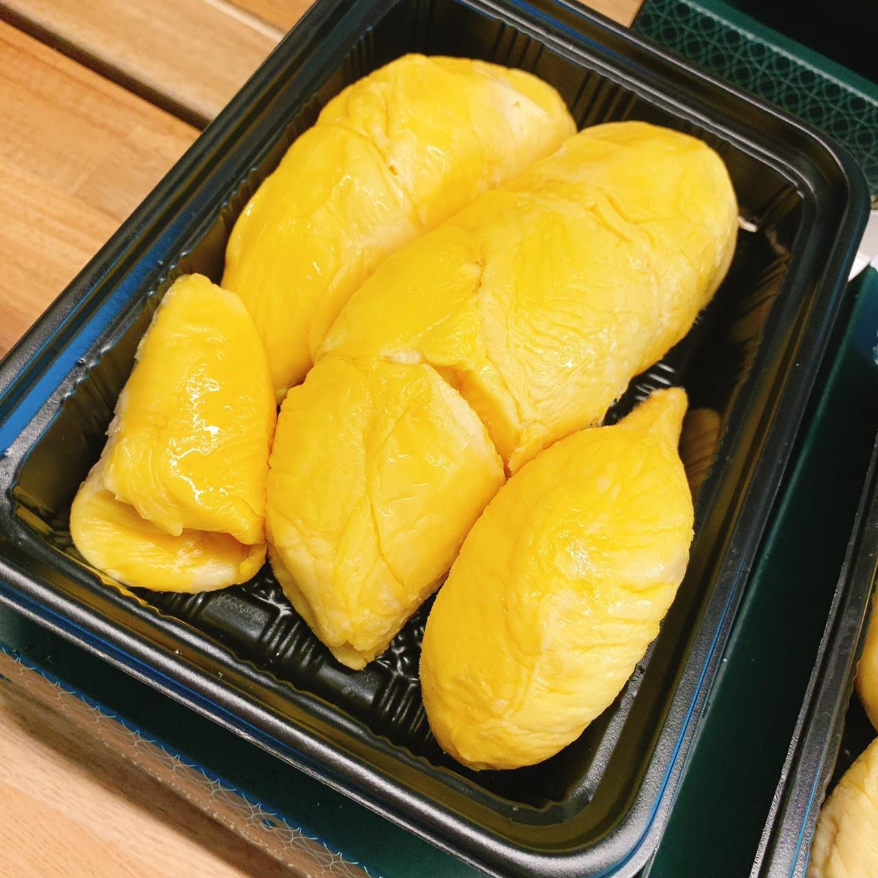 【蘇丹王榴槤,D24】淺黃色果肉,比較會乾包(「乾包」肉硬乾爽;「濕包」肉軟香滑),肉質甜而不膩,層次豐富帶酒香味,因而又有「奶香榴槤」之稱。