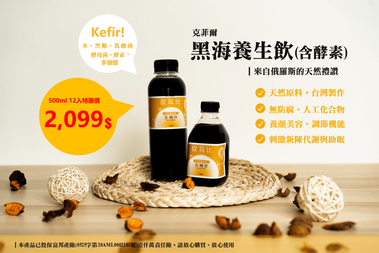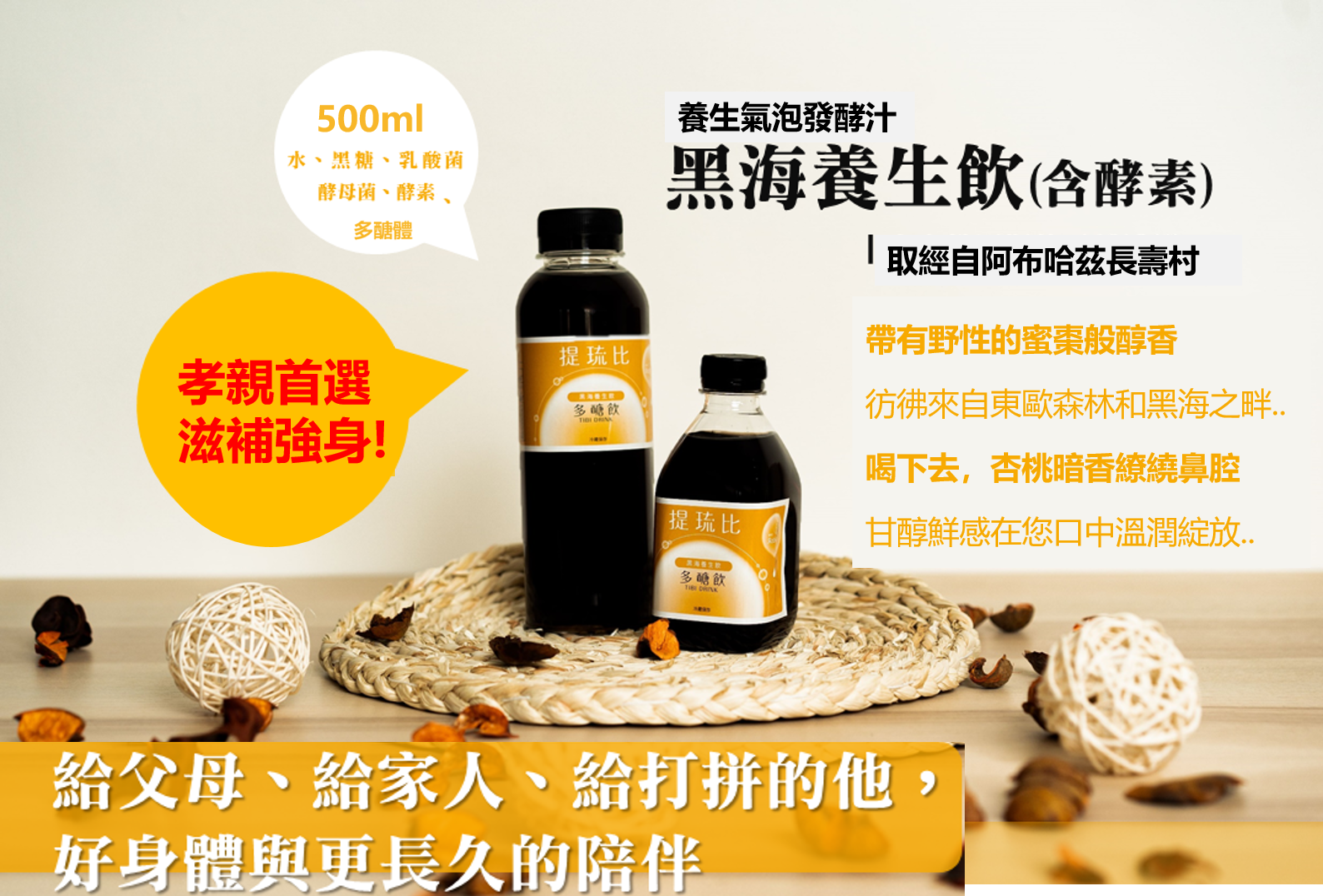 黑海養生飲|水、黑糖 (為發酵原料,多數已轉化為多醣體)、克菲爾益生菌共同發酵而成的養生發酵汁。