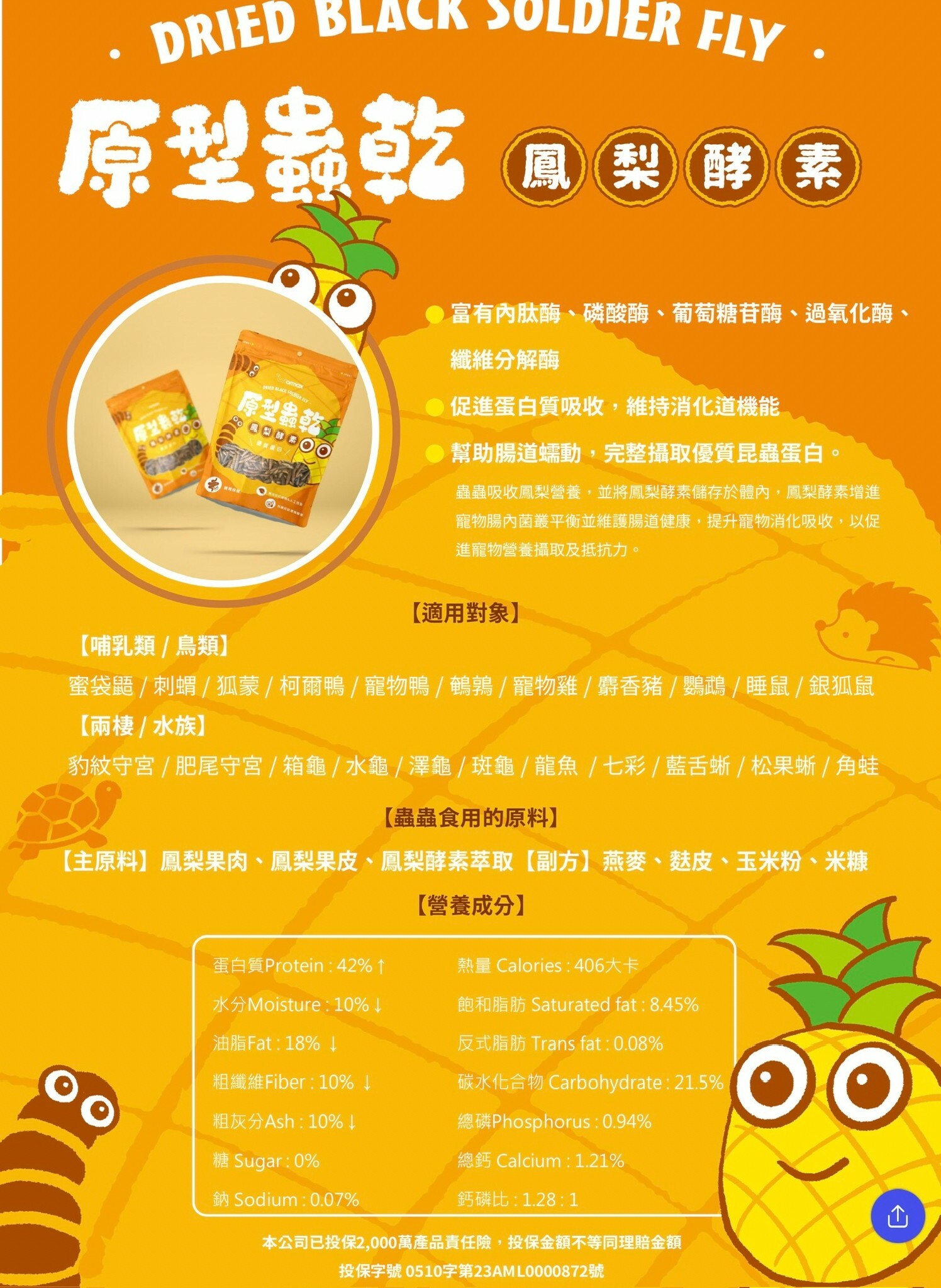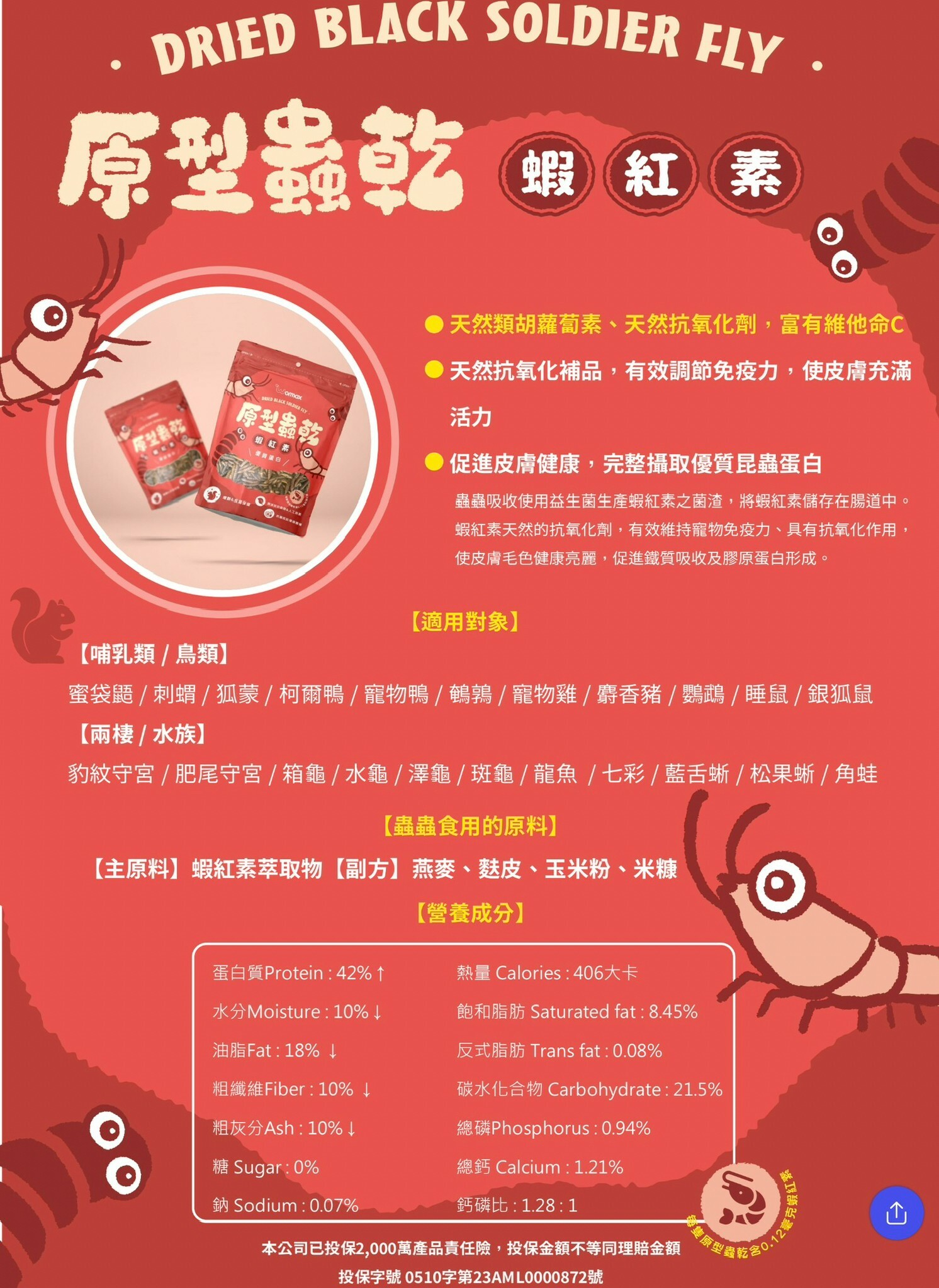 【適用動物】貓犬、雞鴨、雪貂、柯爾鴨、鸚鵡、紅龍魚、中華花龜、蜜袋鼯、刺蝟、花栗鼠、黃金鼠、倉鼠、狐獴、食蟲性鳥類、角蛙、澤龜、守宮、鬃獅蜥、螞蟻等各種食蟲性動物