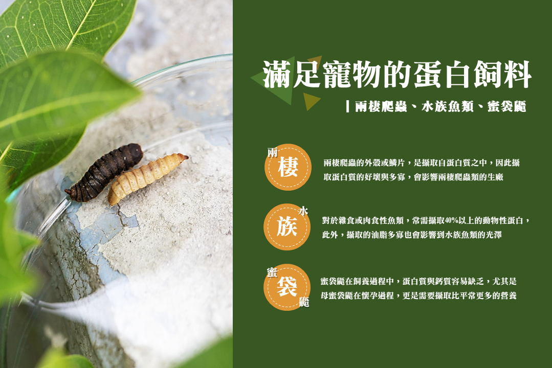 將來自天然農業副產物\ 植物性原料進行餌料配置及飼養,絕不使用任何廚餘與家禽畜糞便,符合國際飼料級昆蟲養殖法規。