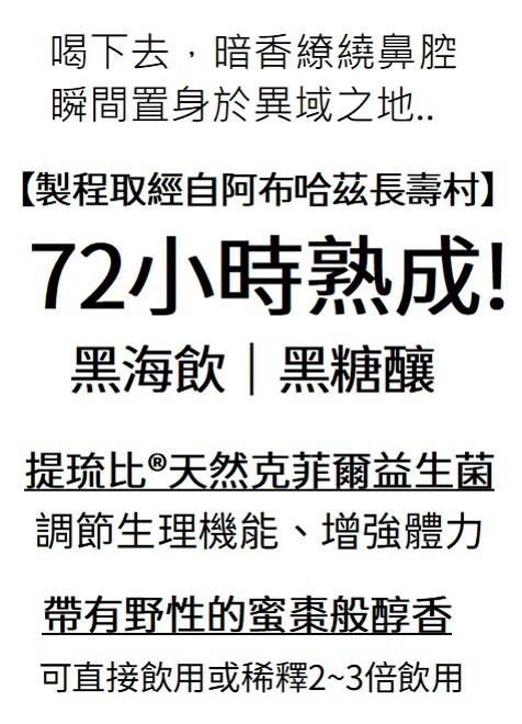 黑海養生飲|水、黑糖 (為發酵原料,多數已轉化為多醣體)、克菲爾益生菌共同發酵而成的養生發酵汁。